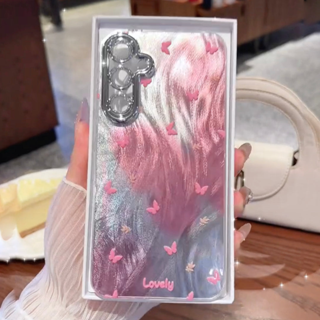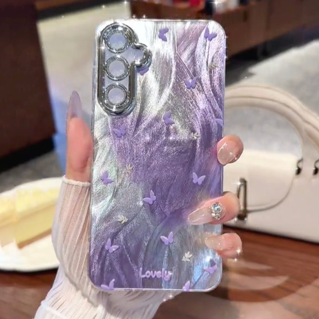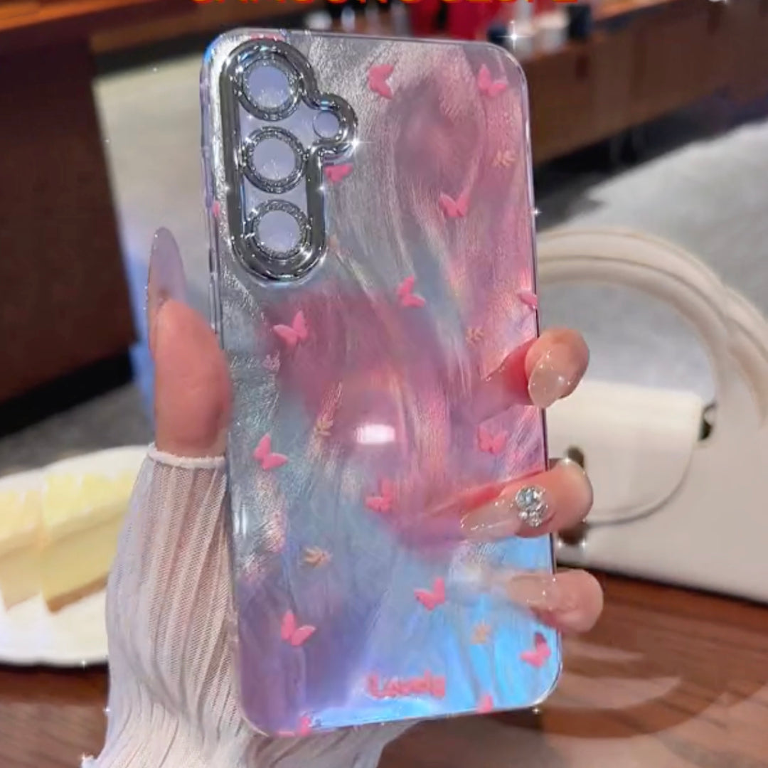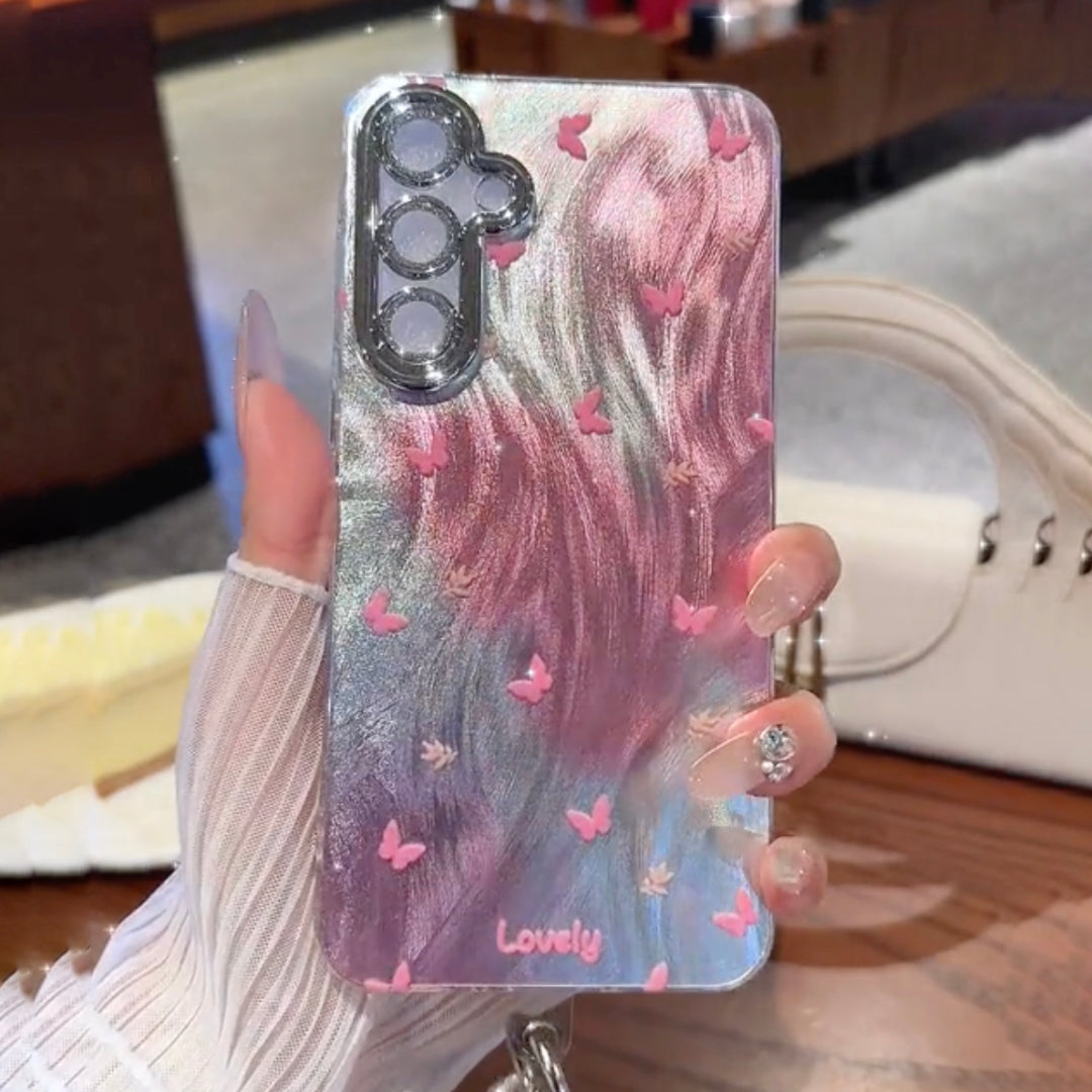 Embrace the magic of motion and color with the hone case — where whimsy meets elegance. Featuring a mesmerizing iridescent backdrop that shifts from soft lavender to glistening pink, this case is dotted with tiny, raised butterflies that seem to dance with every turn.