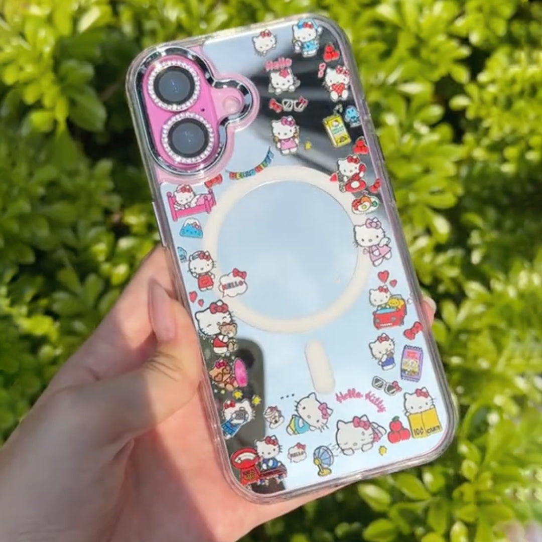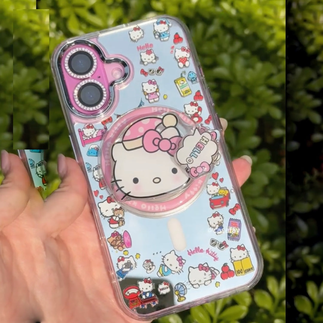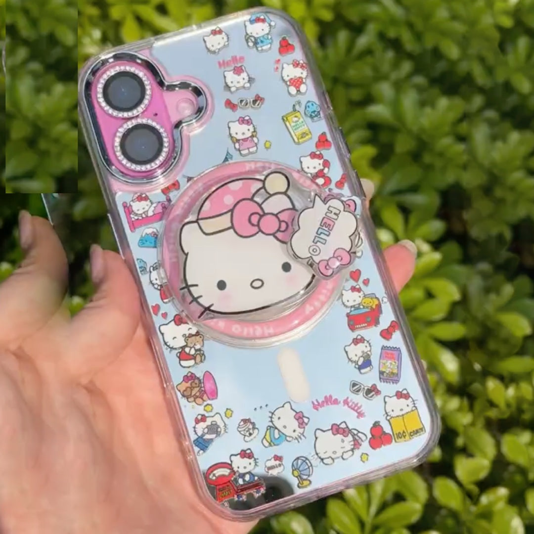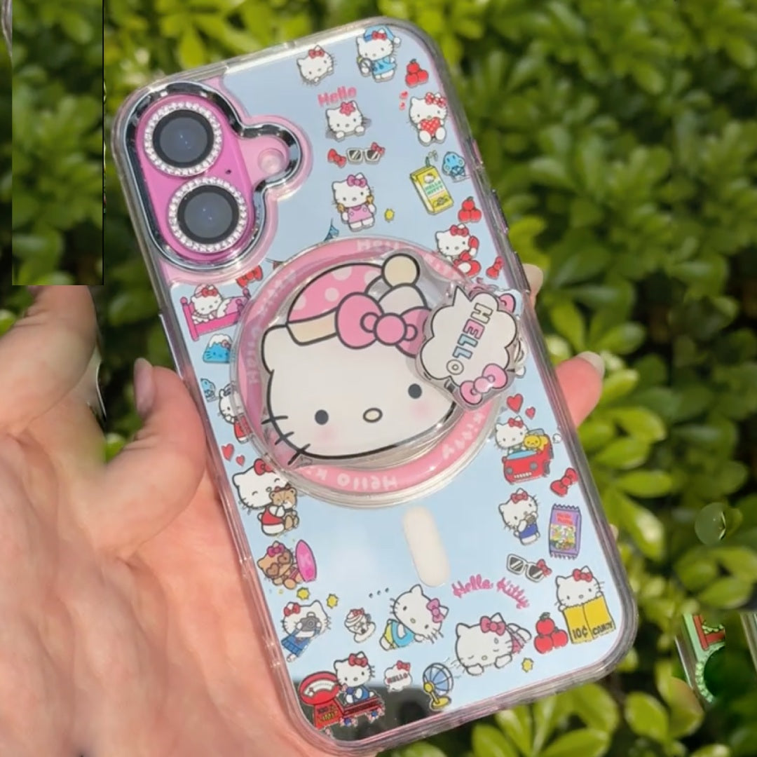 This phone case is a delightful blend of whimsical charm and practical functionality, designed for the ultimate Hello Kitty enthusiast. The clear base of the case serves as a playful canvas, adorned with a vibrant array of smaller Hello Kitty characters in various poses and alongside adorable everyday items like milk cartons and miniature vehicles.Â