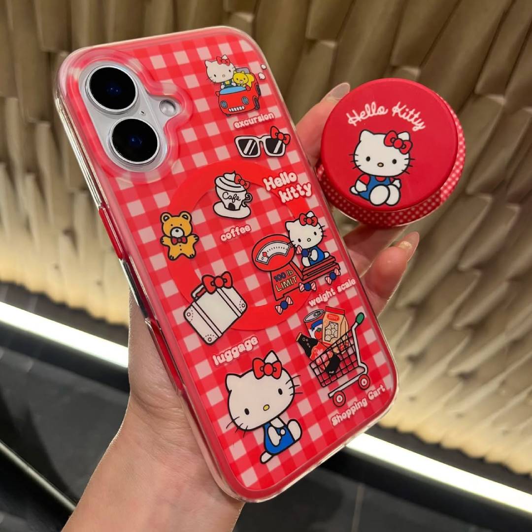 - Design: Features multiple cute Hello Kitty illustrations — from shopping scenes to road trips — all set on an eye-catching red checkered backdrop.