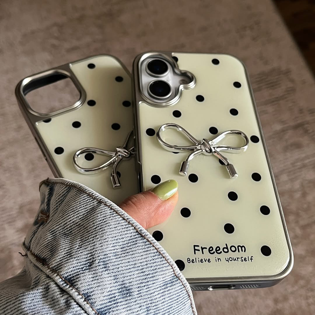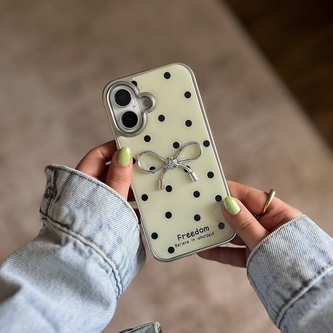 Knotty Dot brings together timeless charm and modern confidence in one adorable phone case. Designed with a soft cream base covered in playful black polka dots, this case is perfectly tied together with a metallic silver bow at the center — adding just the right touch of flair. A subtle “Freedom – Believe in yourself” quote at the bottom adds a daily dose of motivation, making this case a blend of fashion and feel-good vibes.
