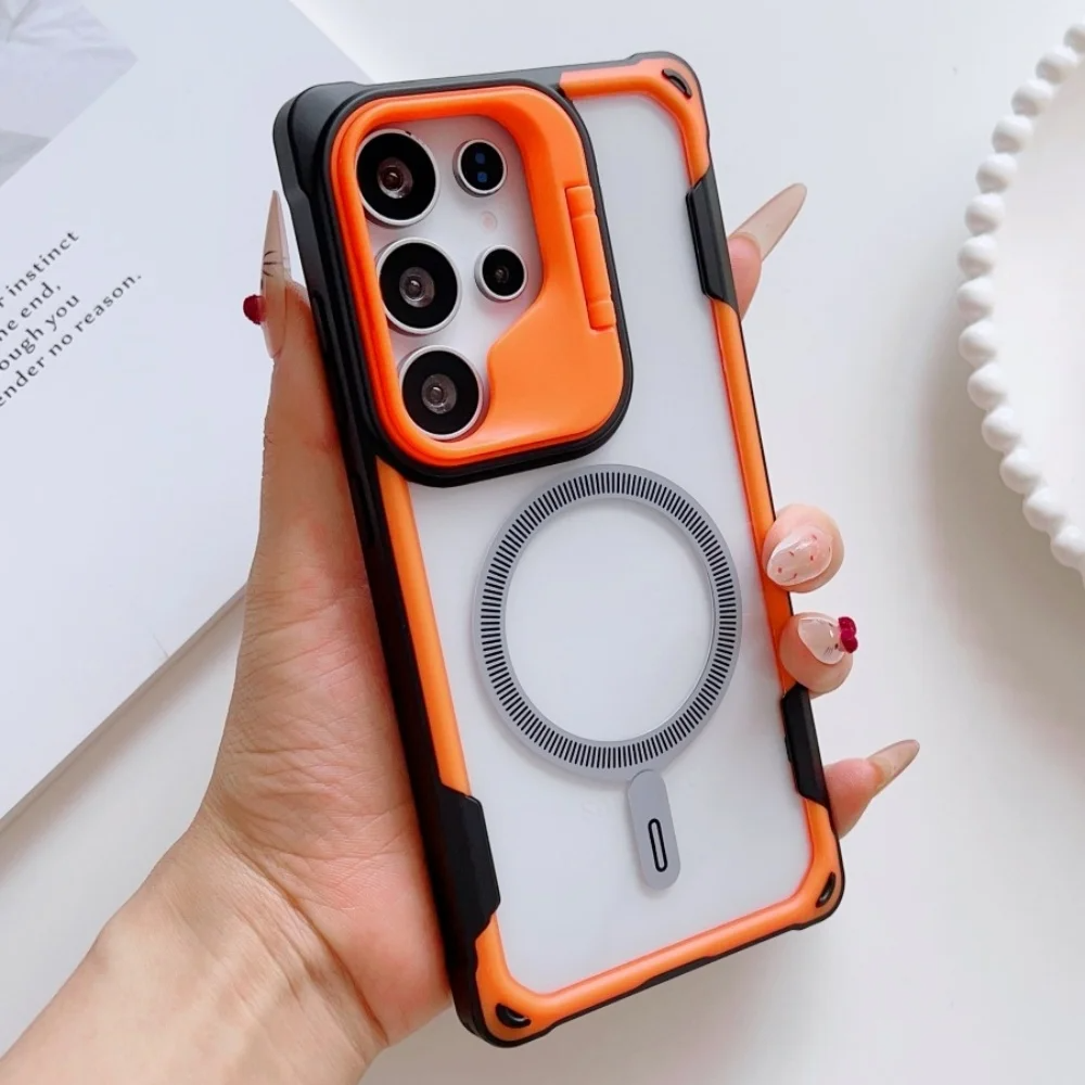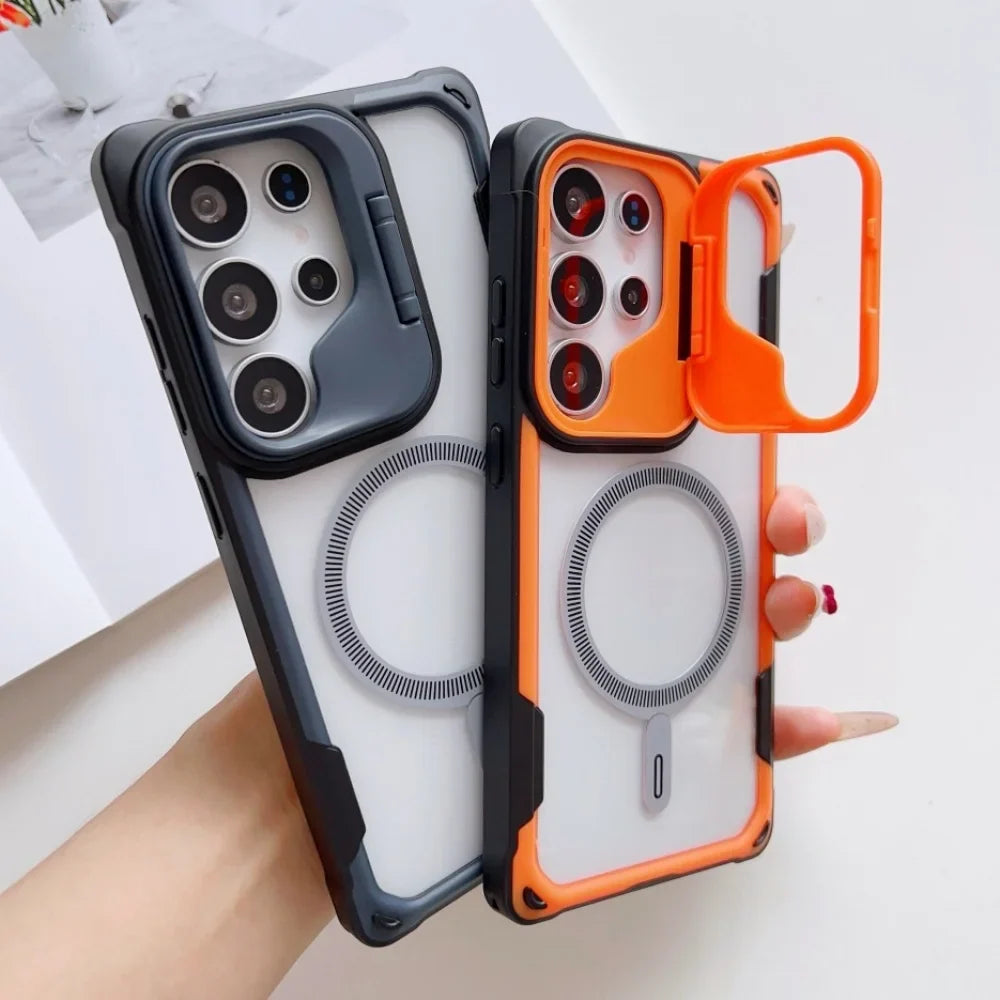Unleash bold protection with a sleek, magnetic armor design. Crafted with a foldable lens stand, shockproof bumper, and a crystal-clear acrylic shield, this case is designed to deliver fearless style and flawless durability.