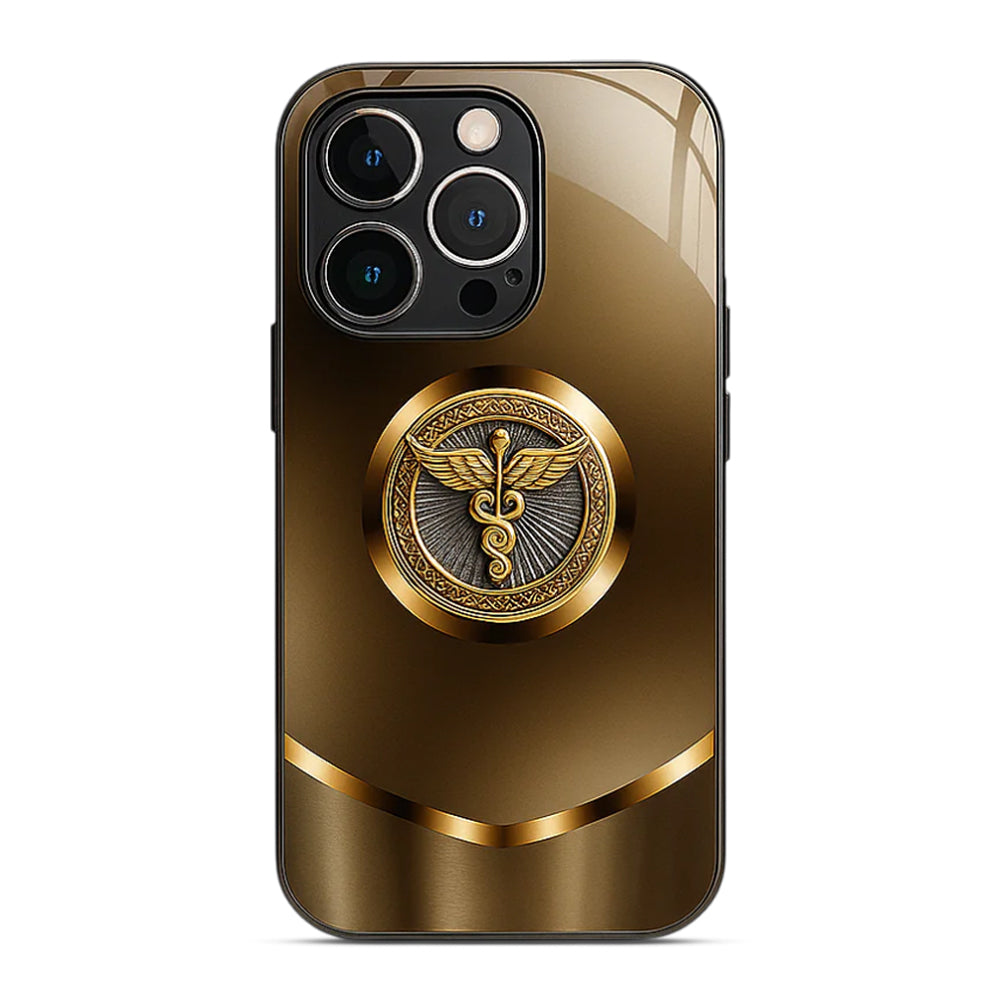 Crafted for those who value sophistication and purpose, this premium glass case features a golden caduceus medallion set against a frosted gradient finish, symbolizing healing and prestige. The tempered glass back adds a touch of elegance while offering scratch resistance and durability. A reinforced shockproof frame ensures protection without compromising style, making it the perfect blend of luxury and functionality.