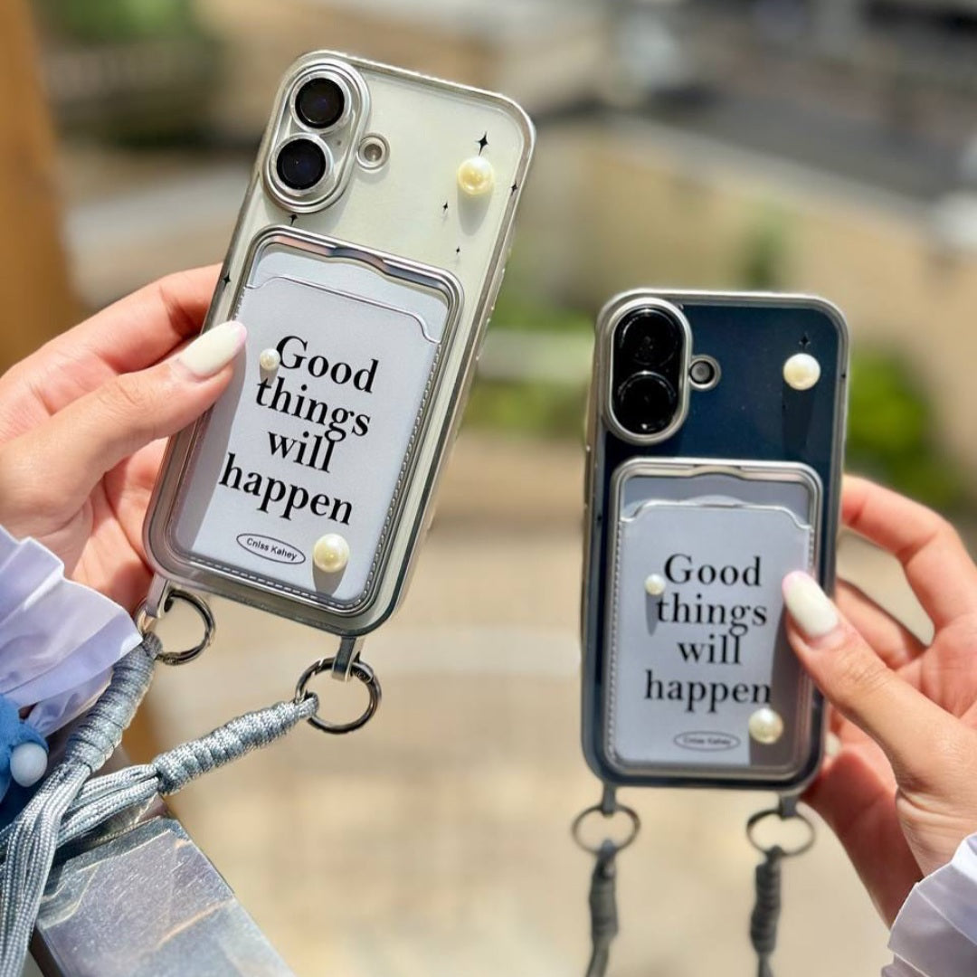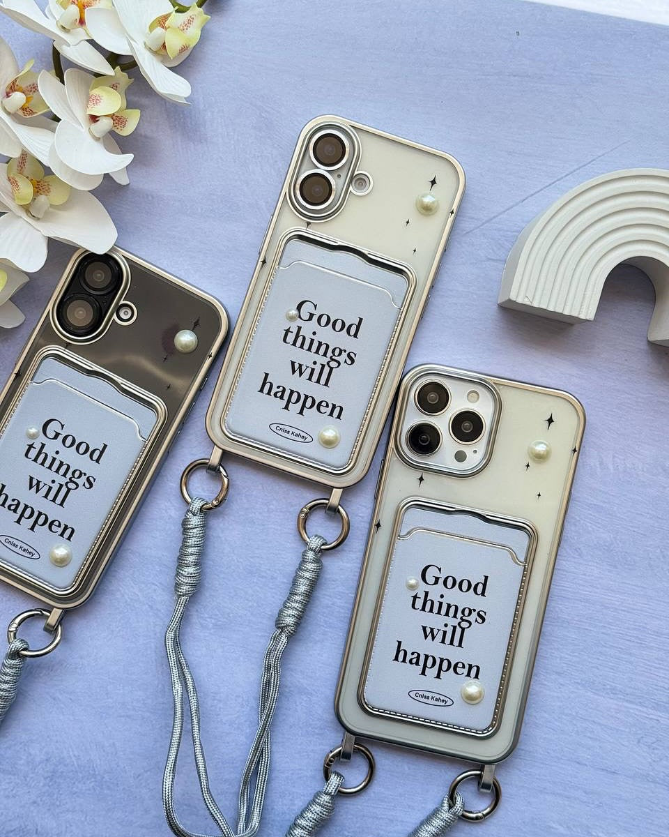 Elevate your daily style with this elegant and inspirational phone case, featuring a sleek pearl-accented design and the uplifting message: “Good things will happen” Crafted to combine minimal aesthetics with practical function, this case includes a built-in card holder and a matching lanyard for added convenience. Whether you're heading out or staying in, it’s a gentle reminder to stay hopeful and stylish every step of the way.