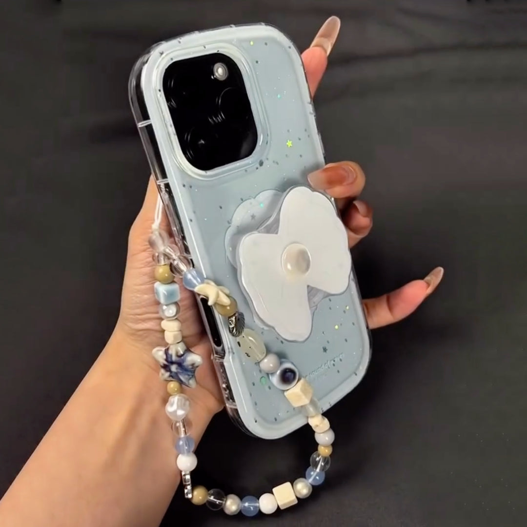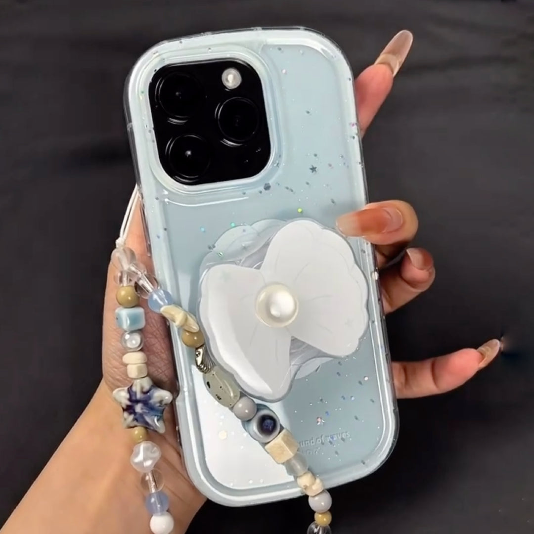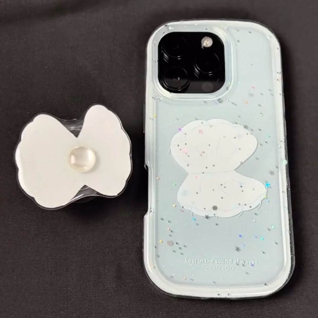 Step into subtle sophistication with Pearl Mirage – a dreamy fusion of ethereal shimmer and graceful floral elegance. This case captures the essence of a soft celestial glow with its icy-blue base, scattered with stardust-like sparkles and crowned with a delicate white flower pop socket featuring a lustrous pearl at its heart.Â