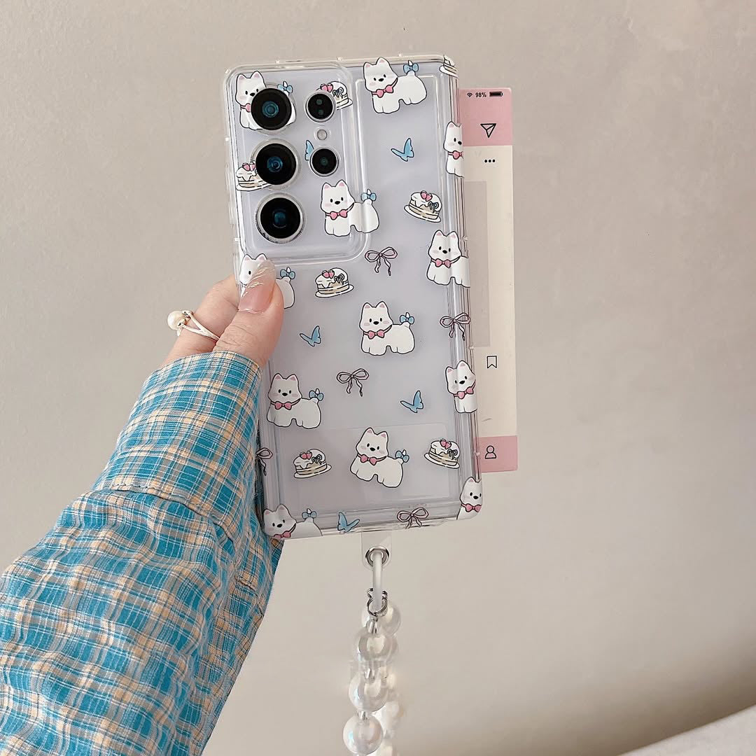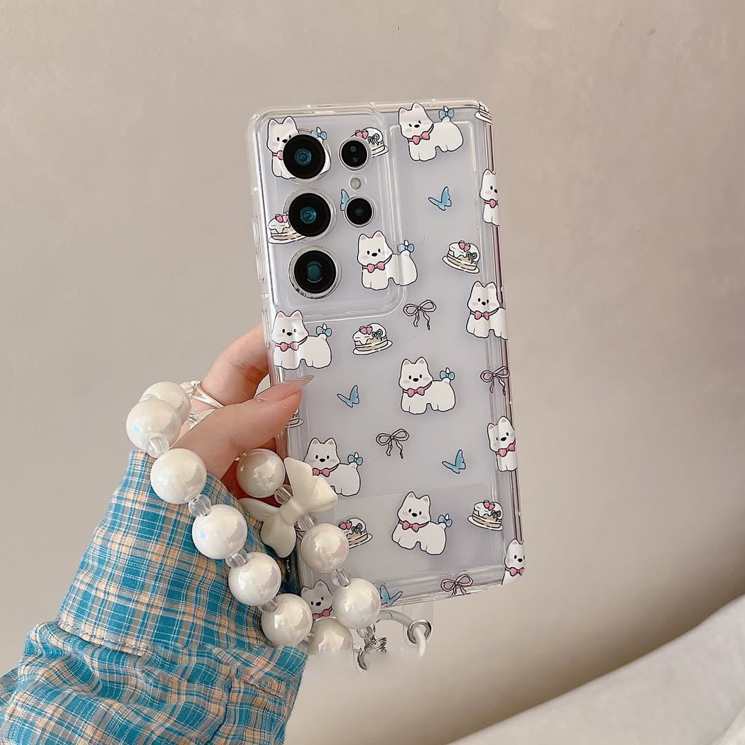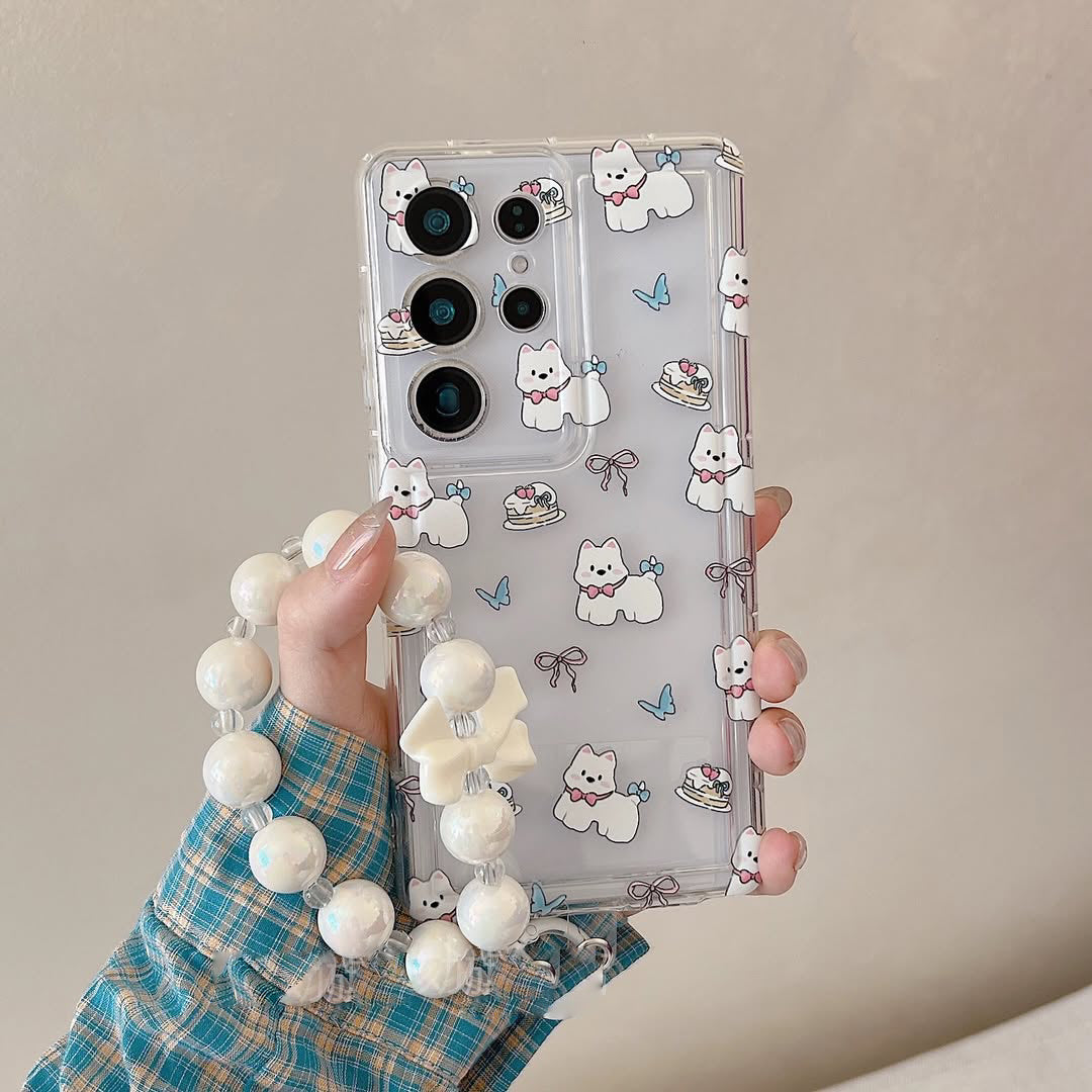 Wrap your phone in adorable charm with the Pearly Pup case – the perfect mix of playful design and elegant accessories. This clear, flexible case features cute white puppies with pink bows, sweet slices of cake, tiny butterflies, and dainty ribbon motifs – making your phone look like a dreamy dessert party!