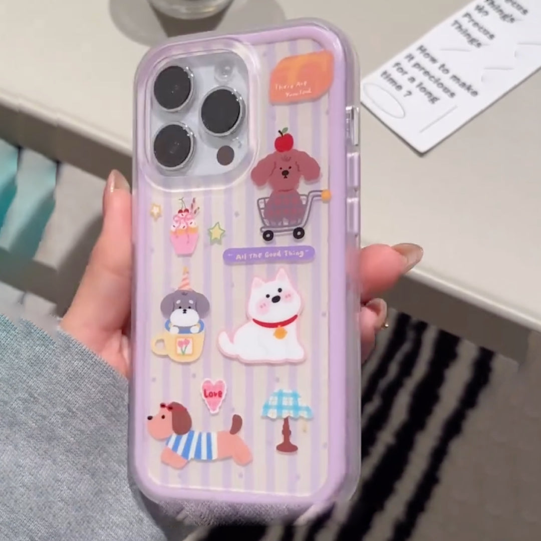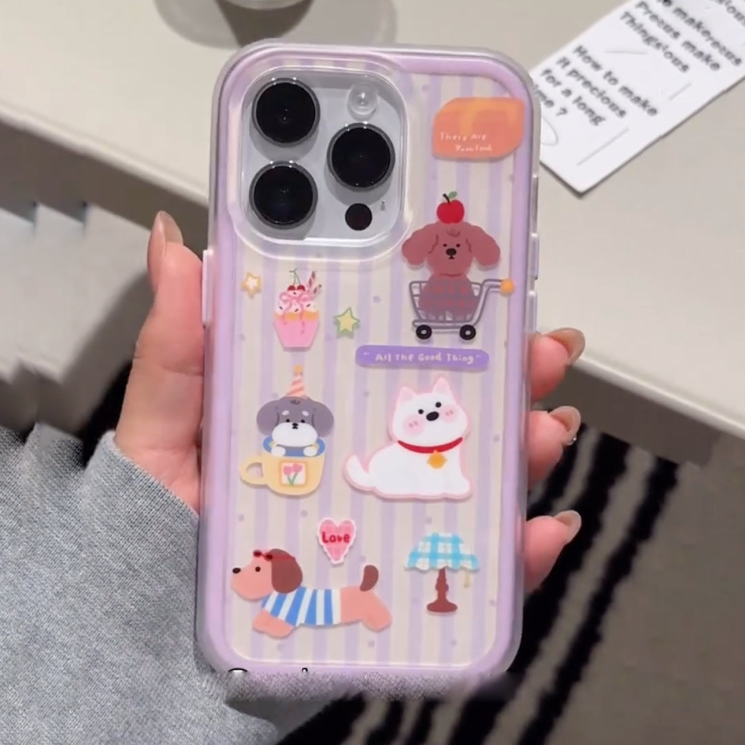 Step into a world of playful charm with Puppy Parade — the perfect phone case for dog lovers and dreamers alike! Featuring an adorable lineup of cartoon pups in fun settings (a shopping cart, a teacup, a striped outfit, and more!), this case brings joy and cuteness to your everyday routine. The pastel purple striped background adds a soft, cozy vibe that pairs perfectly with your playful side.