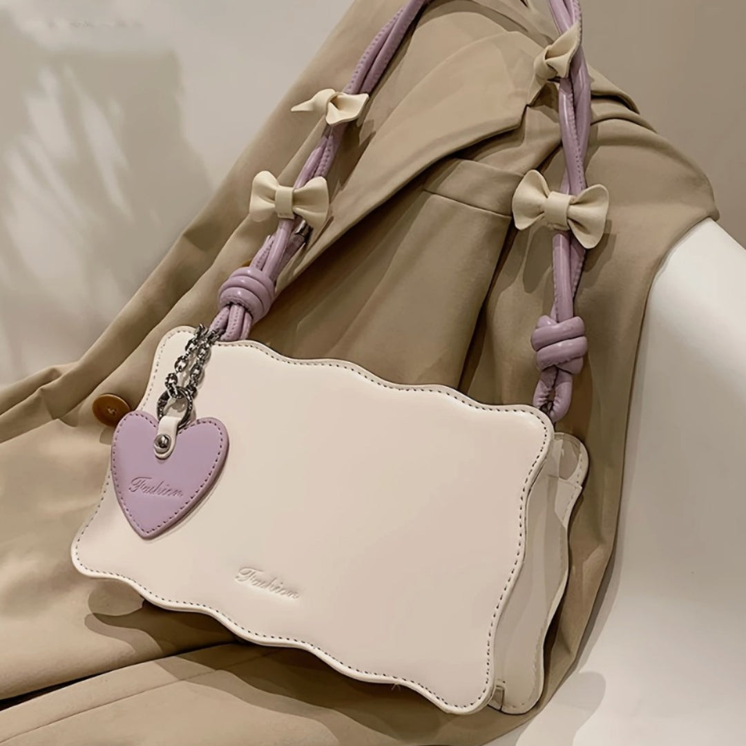 Delicate, dreamy, and full of charm — Ribbonette is your new go-to statement piece. Designed for lovers of soft aesthetics and playful elegance, this handbag combines creamy vanilla tones with lilac accents and dainty bow details along a twisted rope strap. Its scalloped edges and heart-shaped charm add a whimsical touch that turns any outfit into a fairytale moment.