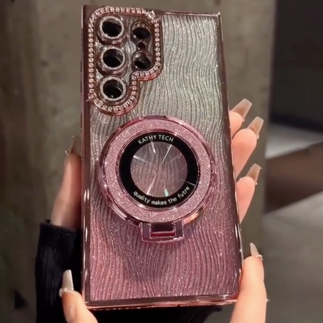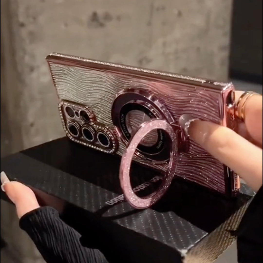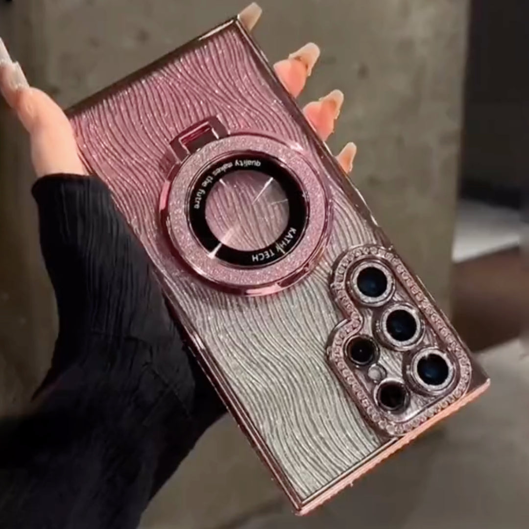 Step into the spotlight with the Rose Radiance Luxe Case a perfect fusion of fashion-forward sparkle and smart functionality. Designed for the bold and beautiful, this case features a stunning rose gold gradient with a shimmering textured finish, complete with a built-in rotating ring holder and a rhinestone-encrusted camera guard. It's more than just a case it’s a style statement.